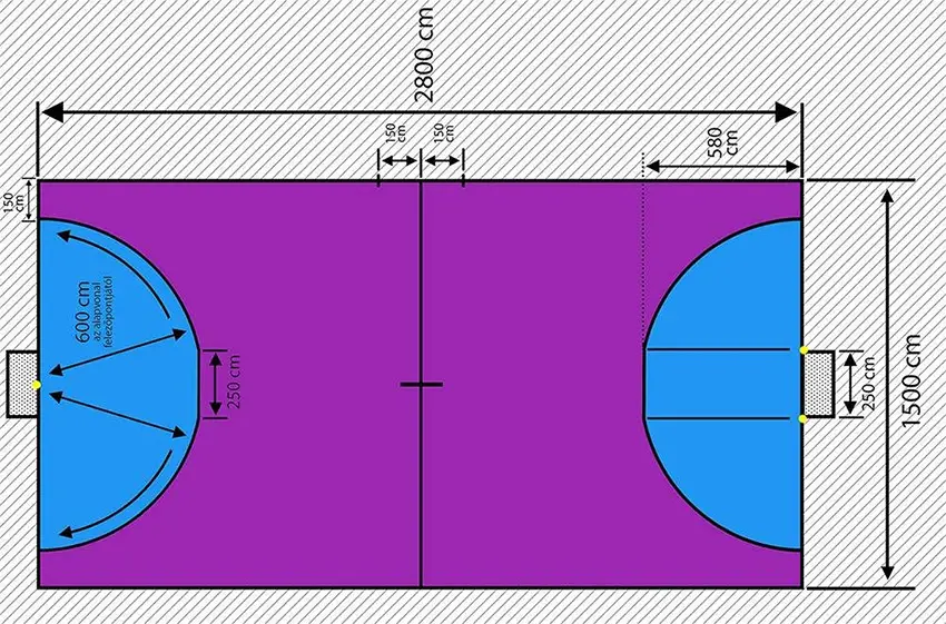 A játéktér téglalap alakú terület, amelynek hossza 28 méter, szélessége 15 méter. A kapuelőtér vonal a kapu közepéből húzott 6 méter sugarú félkörív. Az alap – és oldalvonal 5 centiméter széles folytonos vonal. A cserevonal a középvonaltól mindkét irányban 150 cm távolságra lévő 15 cm hosszú szakasz. A kapu az alapvonal közepén áll, mérete: 150-160 centiméter magas és 240-250 centiméter széles. A játékidő: 2 x 15 perc (5 perc szünettel), időkérés nincs. A labda anyaga bevonatos szivacs, 15-16 centiméter átmérőjű és 140-170 gr súlyú. Lehetőség szerint több labdát kell előkészíteni mérkőzésenként. A játéktéren egy időben 5 mezőnyjátékos és 1 kapus tartózkodhat. Egy mérkőzésre legalább 6 és legfeljebb 12 játékost lehet benevezni. A kapus a mezőnyben nem szerepeltethető hatodik mezőnyjátékosként.